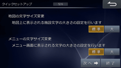 地図上に表示される施設名称の文字の大きさと、メニューの文字サイズを選びます。「地図の文字サイズ変更」と「メニューの文字サイズ変更」の[標準]または[大]にタッチして選び、[次へ→]にタッチします。
