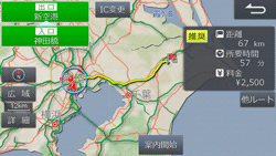 ルート探索終了後、ルート探索結果画面が表示されます。ルートを確認後、[案内開始]にタッチするとルート案内が開始されます。または走行すると、選択されているルートで案内が開始されます。
