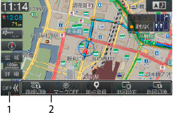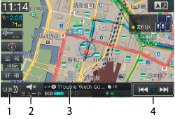 3.タイトル/ソース名称、チャプター番号/曲番号/受信チャンネル/受信周波数が表示されます。タッチするとナビ操作スイッチに切りかえます。