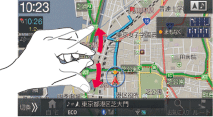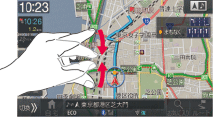 広域地図を表示します。2本の指で画面にタッチしたまま、指を近づけます。