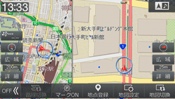 2画面表示のときに左右の自車位置が若干ずれることがあります。これは左右別々に描画しているためで故障ではありません。