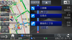 地図表示の仕方を、1画面、2画面、行程ガイド表示から選択できます。またエコインフォ画面を表示できます。