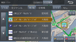 施設リスト表示時に、画面右側地図上の[目的地][経由地]にタッチすると、選択している施設を目的地・経由地に設定できます。