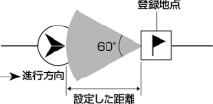 方向を指定したときは、指定した方向に向かって60°の範囲が対象となります。指定した方向に60°の範囲から登録地点に接近したときは接近音が鳴りますが、それ以外の方向から接近したときは接近音が鳴りません。