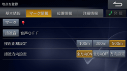 地点登録時に表示される登録地点情報画面で、マーク情報の編集を行います。登録地点のマークを変更したり、地点に近づいたときに注意音や音声を鳴らす接近音の設定をすることができます。接近音を鳴らす距離と方向も設定できます。