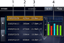 エコインフォ画面で[燃費情報]にタッチすると、燃費情報画面が表示されます。