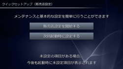 販売店設定は本機取り付け時に販売店で行いますので、通常は操作の必要はありません。クイックセットアップが初期化された場合や再設定が必要な場合は、本設定を行ってください。クイックセットアップ初期化後の初回起動時に設定画面が表示されます。