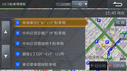 [交通情報]タブにタッチし、[VICS駐車場情報]にタッチすると駐車場リストが表示されます。