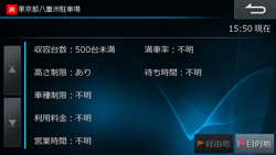 駐車場詳細情報画面、または駐車場リスト表示時の画面右側地図上の[目的地][経由地]にタッチすると、選択している駐車場を目的地・経由地に設定できます。
