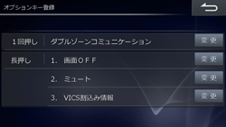 オプションキーに機能を割り当てます。1回押しに1つ、長押しに3つの合計4つの機能を登録することができます(初期設定値は1回押し:「ダブルゾーンコミュニケーション」、長押し「1.画面OFF」「2.ミュート」「3.VICS割込み情報」)。