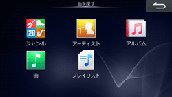 ジャンルやアーティストなど、5つのサーチモードからそれぞれのリスト表示を行い、選択できます。