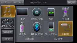 (AUDIO)/[MODE]スイッチを押し、AVソースメニュー画面で[HDMI]にタッチします。