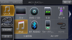 (AUDIO)/[MODE]スイッチを押し、AVソースメニュー画面で[iPod]にタッチします。