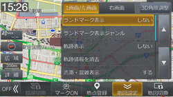 設定項目:ランドマーク表示/ランドマーク表示ジャンル/軌跡表示/軌跡情報を消去/渋滞・混雑表示/空き道表示/渋滞推測(渋滞・混雑)表示/渋滞推測(空き道)表示/VICS駐車場マーク表示/規制マーク表示/VICS提供道路/路上駐車場マーク表示