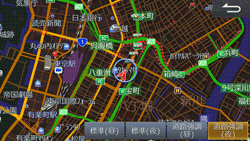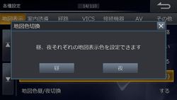本機は画面を見やすくするため、昼画面と夜画面を切りかえることができます。昼、夜それぞれの地図表示色を4 種類から選択できます(初期設定値は、昼「標準(昼)」、夜「標準(夜)」)。
