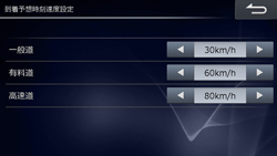 目的地・経由地到着時間予想のための条件(速度)を設定します(初期設定値は「一般道・30km」「有料道・60km」「高速道・80km」)。