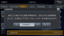 アクティブルートサーチの到着予想時刻が何分以上短縮された場合に変更するのかを、5分~30分の範囲で、5分刻みで設定できます(初期設定値は「15分以上」)。