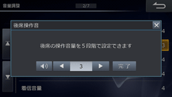 リアスピーカーから出力される、リモコン操作する時の操作音音量を調整します。操作音をOFFにすることもできます(初期設定値は「3」)。