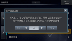 VICS・ブラウザ音声読み上げの音量を調整します(初期設定値は「4」)。