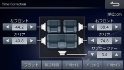 補正時間:リスニングポジションと各スピーカーまでの距離で調整します。単位はcm。スイッチには[補正時間]と表示されます。