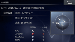 [車両情報]タブにタッチし、[GPS情報]にタッチします。GPS情報画面が表示され、衛星(GPS・みちびきなど)の受信情報を表示します。