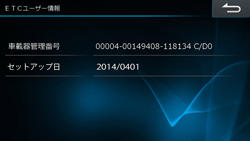 [ETC]タブにタッチし、[ETCユーザー情報]にタッチします。車載器管理番号などのユーザー情報が表示されます。