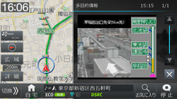 本機では別売のDSRC車載器(HCE-B110V)を接続することにより、道路交通情報や安全運転支援情報を音声や画像で案内したり、渋滞・規制情報を考慮したルート探索ができます。