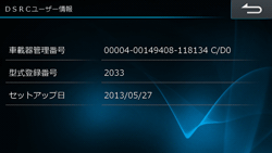 [DSRC]タブにタッチし、[DSRCユーザー情報]にタッチします。車載器管理番号などのユーザー情報が表示されます。