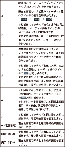 現在地画面に表示されているナビ操作スイッチ/AVソース操作スイッチの左から順に、リモコンの2・3・4・5・6・7が割り当てられています。