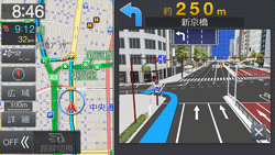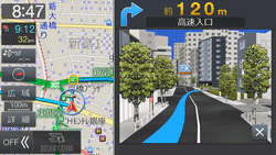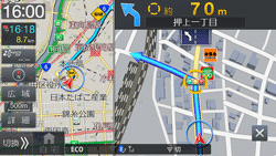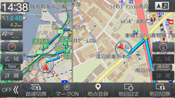 細街路を走行すると自動で2画面表示に切りかわり、右画面に25m市街地図を表示して細街路案内を行います。表示を解除するには[現在地]スイッチを押します。