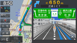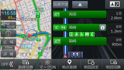 有料道路や高速道路を走行しているとき、情報がある分岐点(JCT)が近づくと、分岐点名称や方面名称が表示されます。
