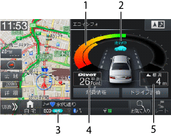 エコインフォでは車速・GPSなどの情報をもとに、ドライブに役立つさまざまな車の情報を表示します。