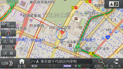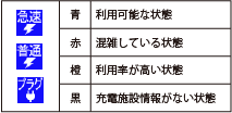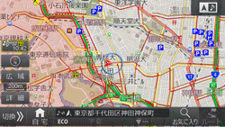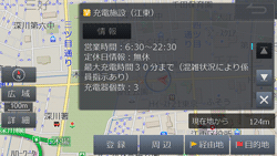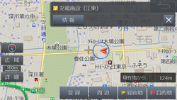 電気自動車用の充電施設を充電方法(急速・普通・プラグイン)に応じたマークで地図上に表示します。また、周辺の充電施設を探すこともできます。