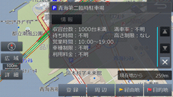 ・駐車場マークにタッチすると、情報が表示されます。[情報]にタッチすると駐車場の詳細情報が表示され、情報の重なりがある場合は[次へ]にタッチすると近くの駐車場マークを選択します。