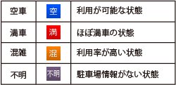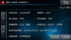 VICSと提携している駐車場をリスト表示し、現在の混み具合のほか、地図や詳細情報を確認できます。