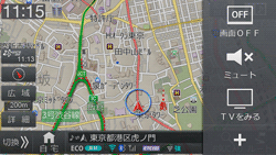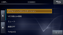 設定値:ダブルゾーンコミュニケーション/VICS割込み情報/ミュート/画面OFF/サイドカメラ/フロントカメラ/インターフェースボックス/エネルギーモニター/TVを見る/自宅に帰る(地図画面のみ操作可能)/ハンズフリー/後席個別ON/OFF/ダブルゾーンメニュー/画質調整/交通情報を聞く