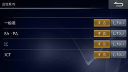 一般道路の合流、高速道路のSA・PA出口、インターチェンジ(IC)、ジャンクション(JCT)など、合流が近づいた時に警告するかどうかを設定できます(初期設定値はすべて「する」)。