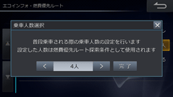 普段乗車する人数の設定を行います。設定された人数は燃費優先ルート探索条件として使用されます(初期設定値は「4人」)。