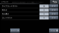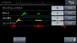 リアカメラ、フロントカメラ、サイドカメラのガイド表示をON/OFFできます。リアカメラガイド線は、固定ガイド線、ステアリング連動ガイド線それぞれをON/OFFできます。