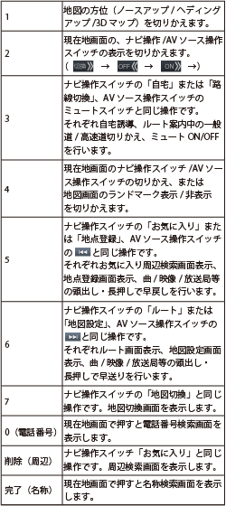 現在地画面に表示されているナビ操作スイッチ/AVソース操作スイッチの左から順に、リモコンの2・3・4・5・6・7が割り当てられています。