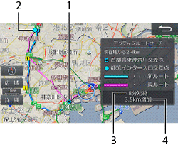 「アクティブルートサーチ」での「交通状況の考慮」および「回避ルート探索(渋滞考慮案内)」は通行止め等の交通規則が発生した場合等、距離、時間ともに増加するルートを表示する場合があります。また、常に渋滞からの回避が行えるわけではありません。