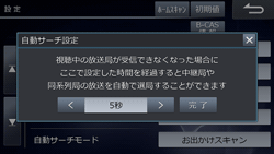 一定時間放送局を受信できないときに、中継局や同系列局の放送局を自動で選局するまでのおおよその時間を5秒刻みで設定できます(初期設定値は「5秒」)。