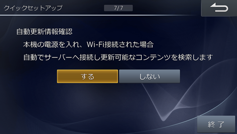 本機の電源を入れた時にWi-Fi接続された場合、自動でサーバーへ接続して本機の更新可能コンテンツの有無を確認するかどうかを設定します。「する」または「しない」にタッチし、[終了]にタッチします。