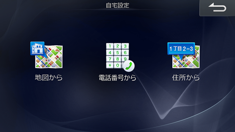 [地図から][電話番号から][住所から]のいずれかにタッチして自宅を検索し、[登録]にタッチします。設定が完了したら[次へ→]にタッチします。