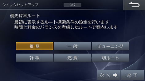 「優先探索ルート」を[推奨][一般][チューニング][幹線][燃費][別ルート]のいずれかにタッチして選び、[次へ→]にタッチします。