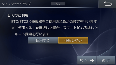 ETC/ETC2.0車載器を使用する場合は、「使用する」にタッチします。