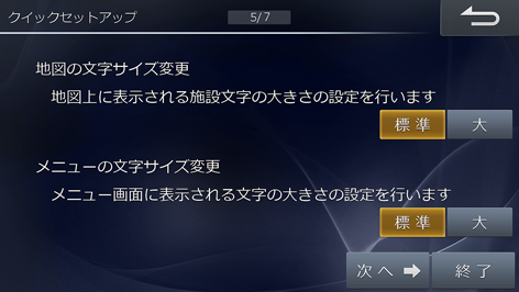 地図上に表示される施設名称の文字の大きさと、メニューの文字サイズを選びます。「地図の文字サイズ変更」と「メニューの文字サイズ変更」の[標準]または[大]にタッチして選び、[次へ→]にタッチします。