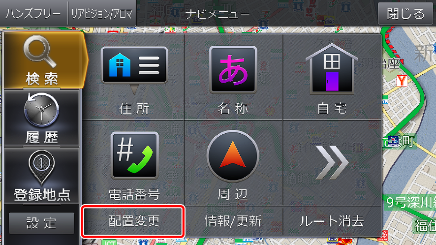 NAVI/[MENU]スイッチを押してナビメニュー画面を表示し、[配置変更]にタッチします。