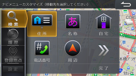 ナビメニュー画面に表示するアイコンの並べ方を変更することができます。よく使うアイコンを1ページ目にまとめて配置するなど、より使いやすい操作画面へのカスタマイズが可能です。