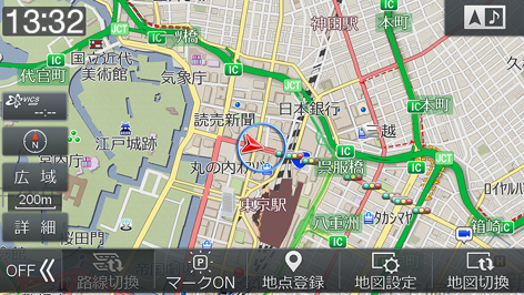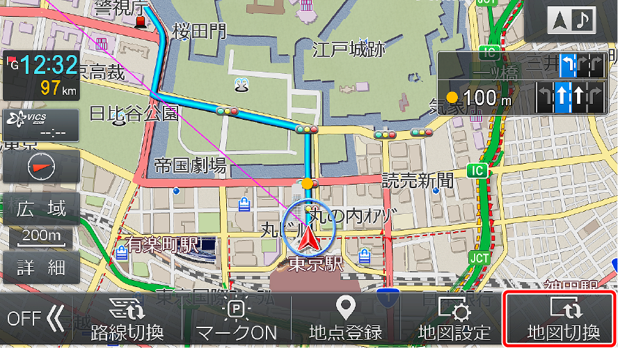 地図切換画面を消すには、再度[地図切換]にタッチします。または地図画面にタッチするか、[現在地]スイッチを押します。
